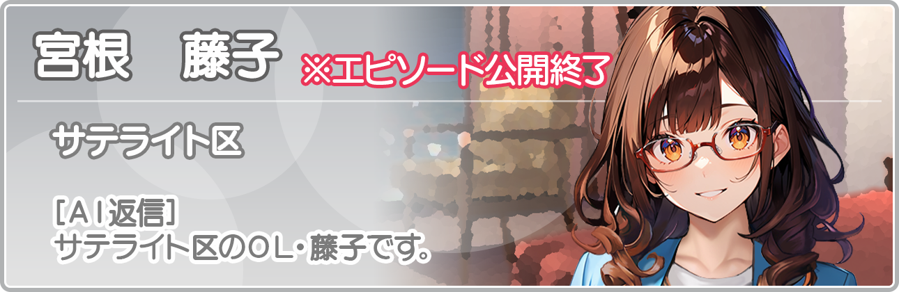 ※宮根藤子のエピソードは自分から終了させない限りずっとチャットをお楽しみいただけます。