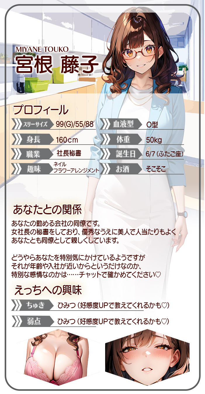 女社長の秘書をしており、優秀なうえに美人で人当たりもよく、あなたとも親しくしています。